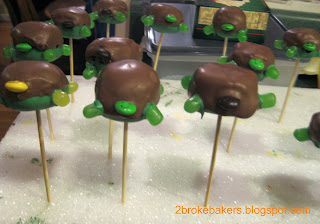 We also made Domos. These used strawberry belts cut, white frosting for the teeth and black frosting for the eyes.The turtles were pretty easy to make. However the key for these cake pops are to make sure the ball is not too flat. It needs to be tall enough for the stick to hold.